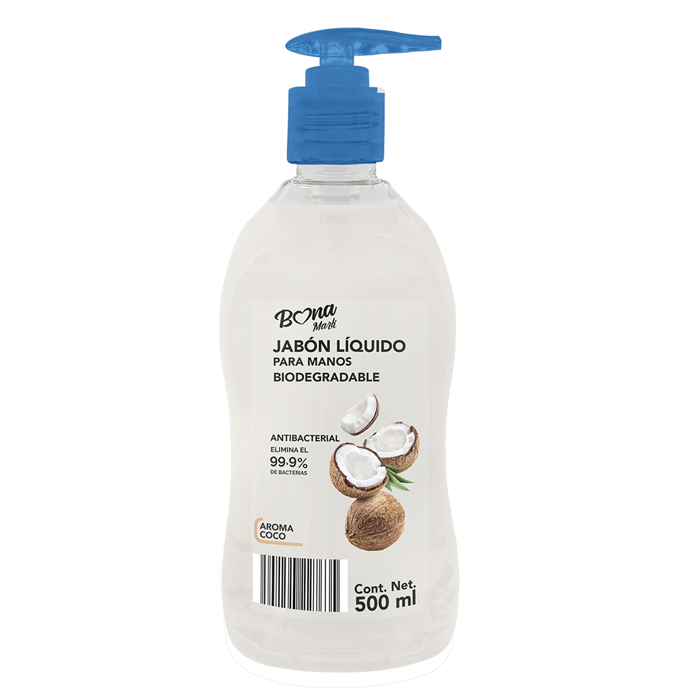 El Jabón Líquido para Manos Aroma Coco BONAMARK de 500 ml es antibacterial y elimina el 99.9% de las bacterias, dejando tus manos limpias y con un refrescante aroma a coco.