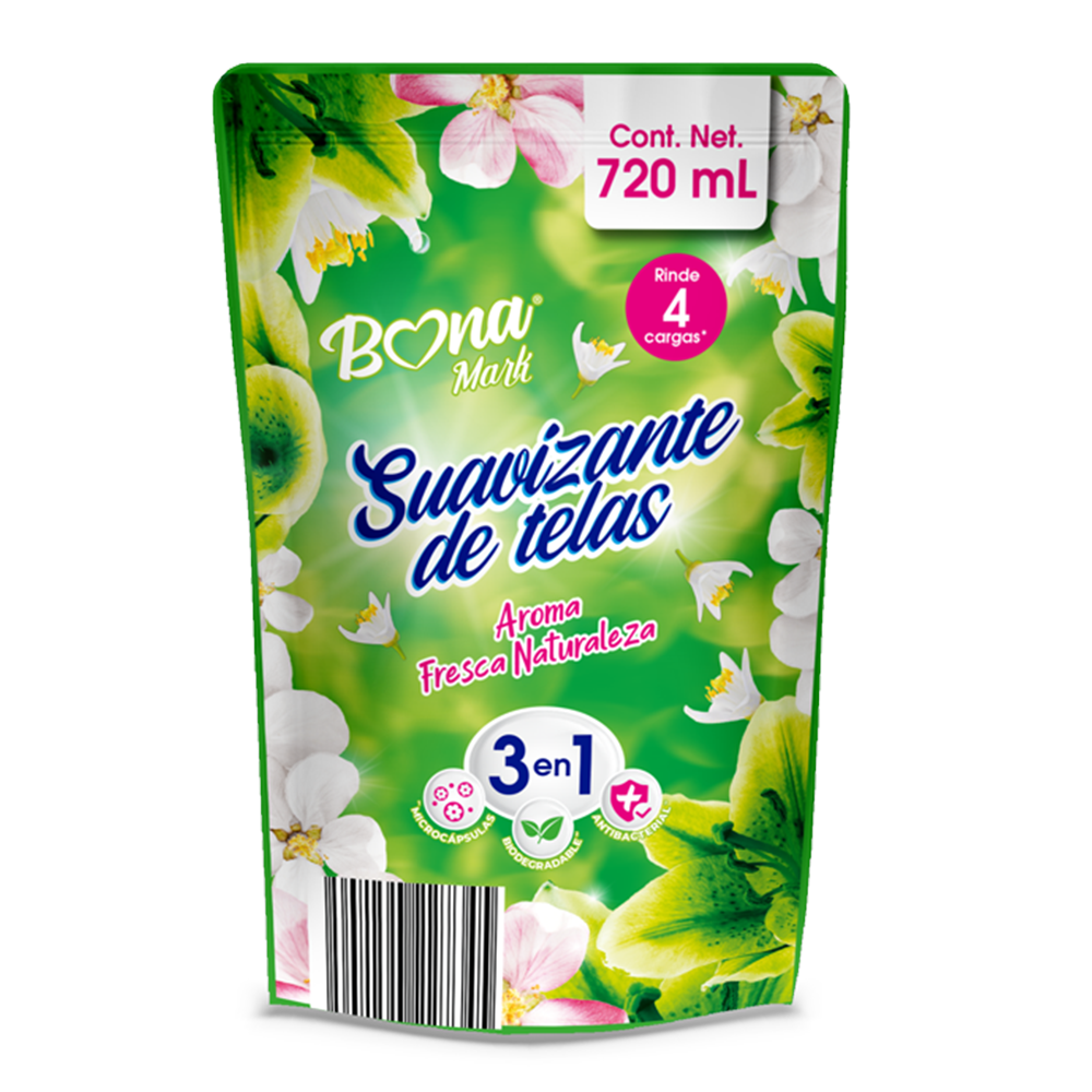 El Suavizante de Telas Fresca Naturaleza BONAMARK de 720 ml ofrece poder 3 en 1 con acción antibacterial, microcápsulas de aroma y fórmula biodegradable. Rinde hasta 4 cargas, dejando tu ropa suave y fresca.